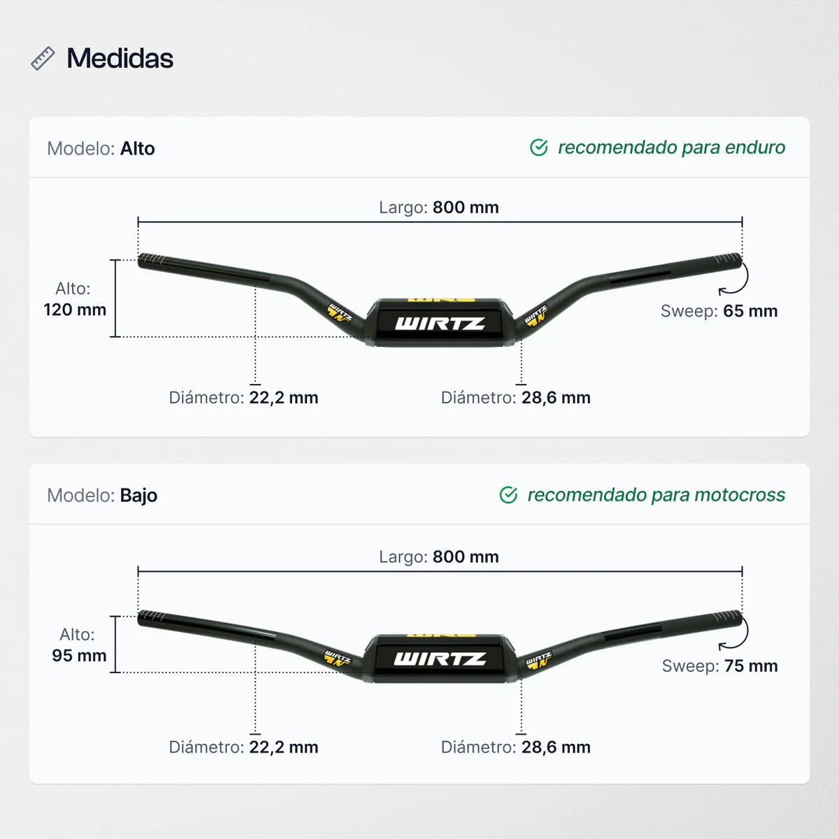 Fabricado 100% en aluminio con tratamiento térmico avanzado y espesor variable para máxima resistencia. Diámetro profesional: 28,6 mm en el centro y 22 mm en los extremos. Sin travesaño, con pad incluido directamente sobre el manubrio para mayor protección sin sumar rigidez.